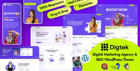 Digtek – Digital Marketing Agency and SEO WordPress Theme. Digtek is a best landing page for SEO, Business, Agency & Startup Company. This theme has creative layout, smooth animation, unique features, modern and unique design which make your website more beautiful. This Theme comes with 3 different home pages version and included 25 valid Inner pages. This theme easily customizable, fully responsive and support all modern browser and device.