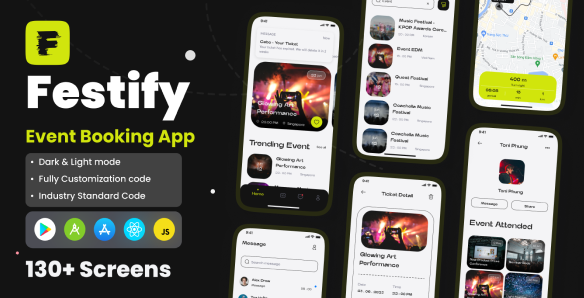 Festify is a cutting-edge event booking app React Native CLI UI Kit designed to revolutionize the way users discover and attend events. Built on the React Native framework, this UI kit offers a seamless and responsive user interface across both iOS and Android platforms, ensuring a consistent and delightful experience for all users. With its modern and intuitive design, Festify simplifies the event booking process, making it easy for users to explore a diverse range of events, from concerts and festivals to conferences and social gatherings.