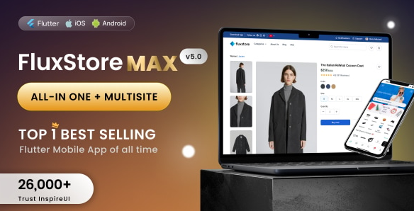FluxStore MAX app is the full multi-site Flutter Application that creates iOS and Android mobile apps for your existing websites (WooCommerce, WordPress, or Listing).